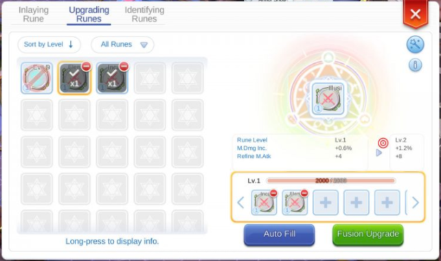 Il est possible de fusionner entre elles les runes de skill afin de les faire monter en grade, reroll les % des bonus ou avoir des runes pour votre classe.